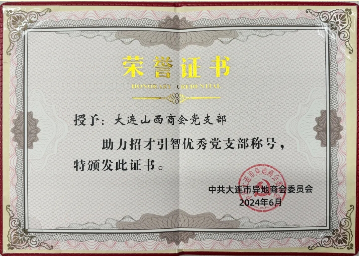 中共大连市山西商会党支部充分发挥党建引领作用,通过实施商会党建“六联动”,将党建工作与招商引资、招才引智工作紧密结合,并获“助力招才引智优秀党支部”称号。