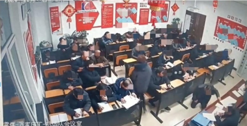视频显示,监控时间为2024年11月26日,地点在万家庄煤矿机运队会议室。视频中,一名男子走进会议室单膝跪地,朝主席台低头作揖后又转身向第一排做出同样动作,随后离开会议室。