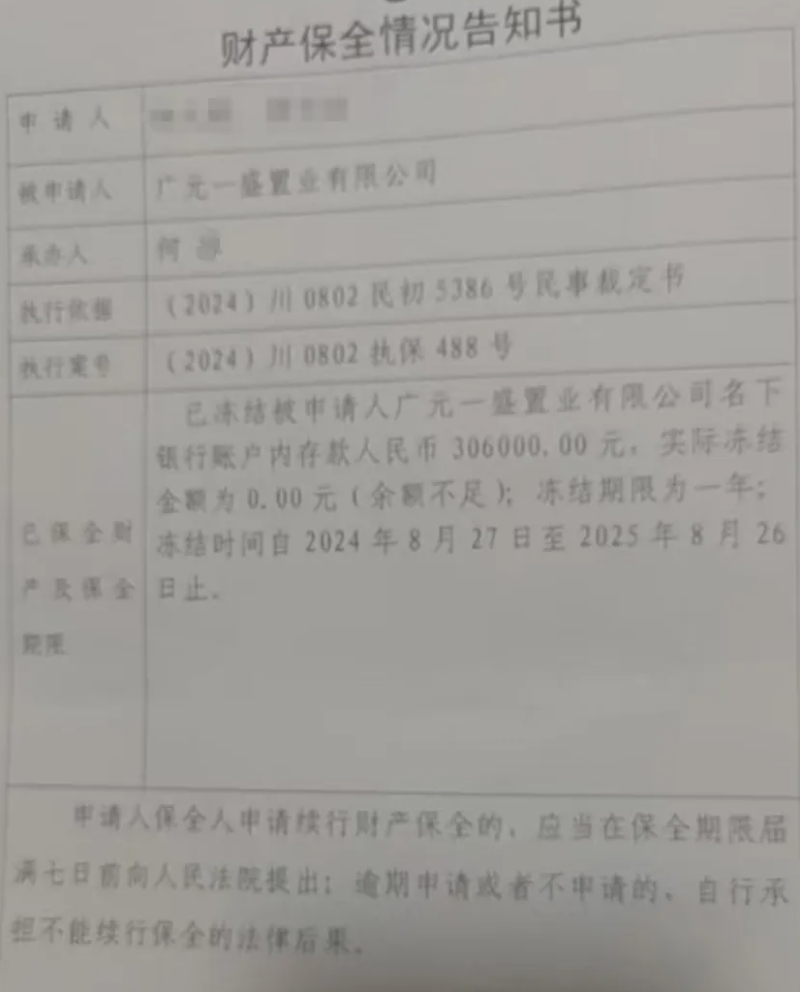 在业主提供的财产保全情况告知书上写着:“被申请人广元一盛名下银行账户内存款人民币306000元,实际冻结金额为0元(余额不足)”。