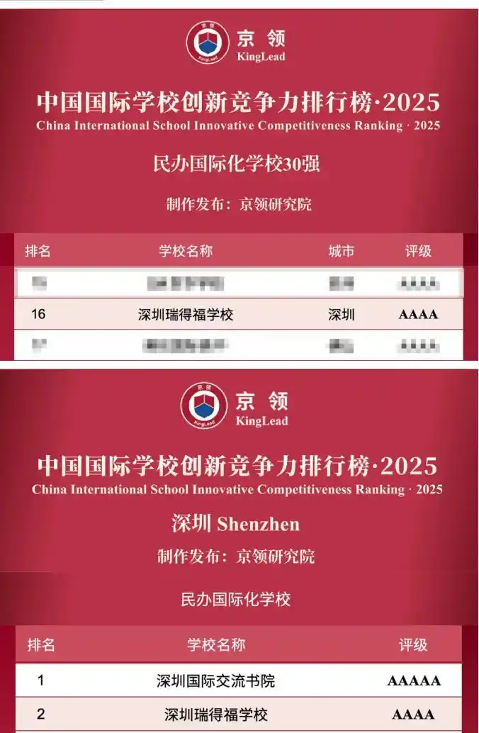 京领研究院2025中国国际学校创新竞争力榜单震撼发布!瑞得福国际学校荣登“2025中国国际学校竞争力百强榜”,瑞得福国际学校位列深圳民办国际化学校TOP2,全国TOP16,斩获"4A"超卓评级!