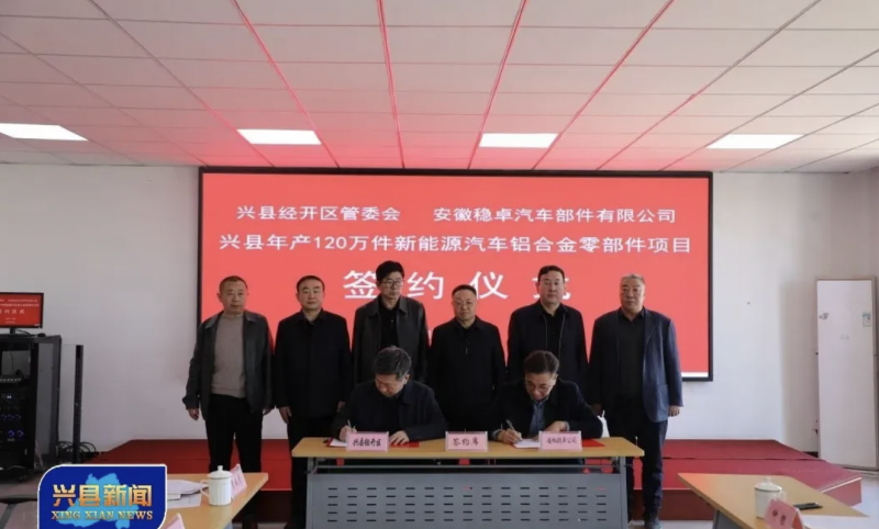 3月18日,县经济技术开发区与安徽稳卓汽车部件有限公司举行兴县年产120万件新能源汽车铝合金零部件项目签约仪式。市政协副主席、县委书记乔云出席仪式并讲话。县经开区党工委书记、管委会主任白继红,管委会常务副主任赵瑞,副主任白永兵,党工委委员李兴平,安徽稳卓汽车部件有限公司董事长周伦强,康翔铝业(泰州)有限公司总经理张博鈞,中亿达自动化科技(苏州)有限公司总经理卜永明,麦格森特集团董事长仲银,山西东南精工科技有限公司总经理李伟出席。