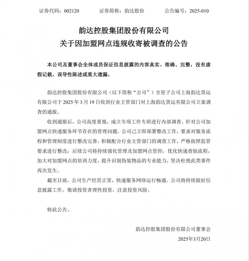 3月20日,据深交所官网公示,韵达股份发布《关于因加盟网点违规收寄被调查的公告》。全资子公司上海韵达货运有限公司于2025年3月19日收到行业主管部门对上海韵达货运有限公司立案调查的通报。《公告》称,收到通报后,公司高度重视,成立专项工作专班进行内部调查。针对公司加盟网点快递服务环节存在的管理问题,公司己立即部署整改工作,要求对服务流程和管理制度进行整改完善,积极配合行业主管部门的调查工作,严格按照监管要求进行整改;后续公司将持续强化管理及加盟网点管控,优化快递查验流程,加大对加盟网点的培训力度,提升识别伪装物品的专业能力,坚决杜绝此类事件再次发生。