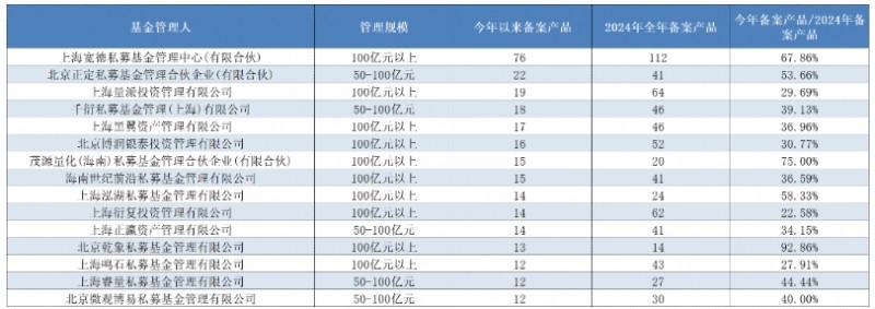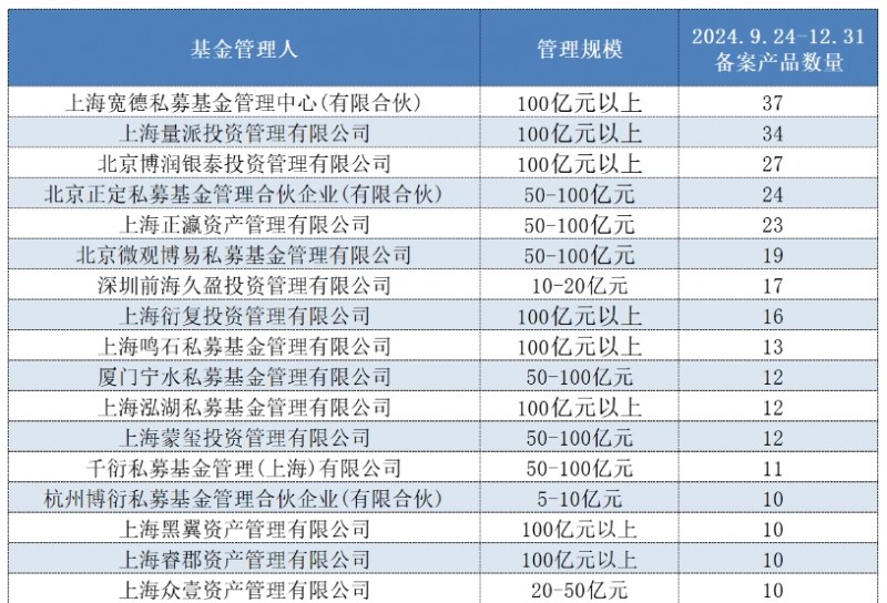表格:2024年9月24日至2024年12月31日备案数量不少于10只的私募名单数据来源:Wind、界面新闻整理