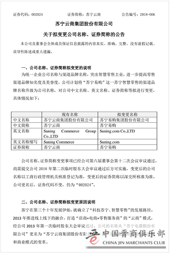 昨天(1月14日)晚上,苏宁突然发布一份拟变更公司名字的公告!(原文如下↓)