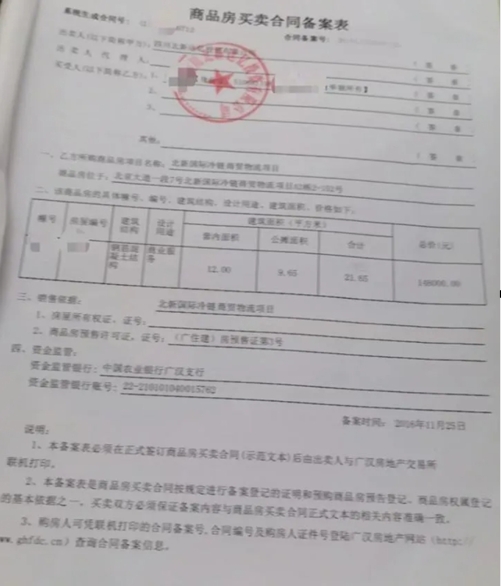 业主诸女士是2018年9月购买的商铺。她告诉记者,《商品房购买合同备案表》显示,中国农业银行广汉支行为北新冷链物流项目的资金监管银行,北新达亿在该行开设了资金监管账户,但经咨询该银行工作人员,备案表中的账号只是北新达亿的基本户,并非资金监管账户,开发商采用工商局固定格式合同,在未开设监管账户的情况下将基本户填在资金监管账户栏,让购房者误认为有资金监管账户,这对购房者已构成欺骗。