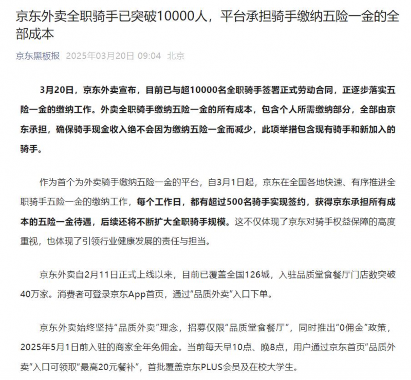 京东表示,作为首个为外卖骑手缴纳五险一金的平台,自3月1日起,京东在全国各地快速、有序推进全职骑手五险一金的缴纳工作,每个工作日,都有超过500名骑手实现签约,获得京东承担所有成本的五险一金待遇,后续还将不断扩大全职骑手规模。