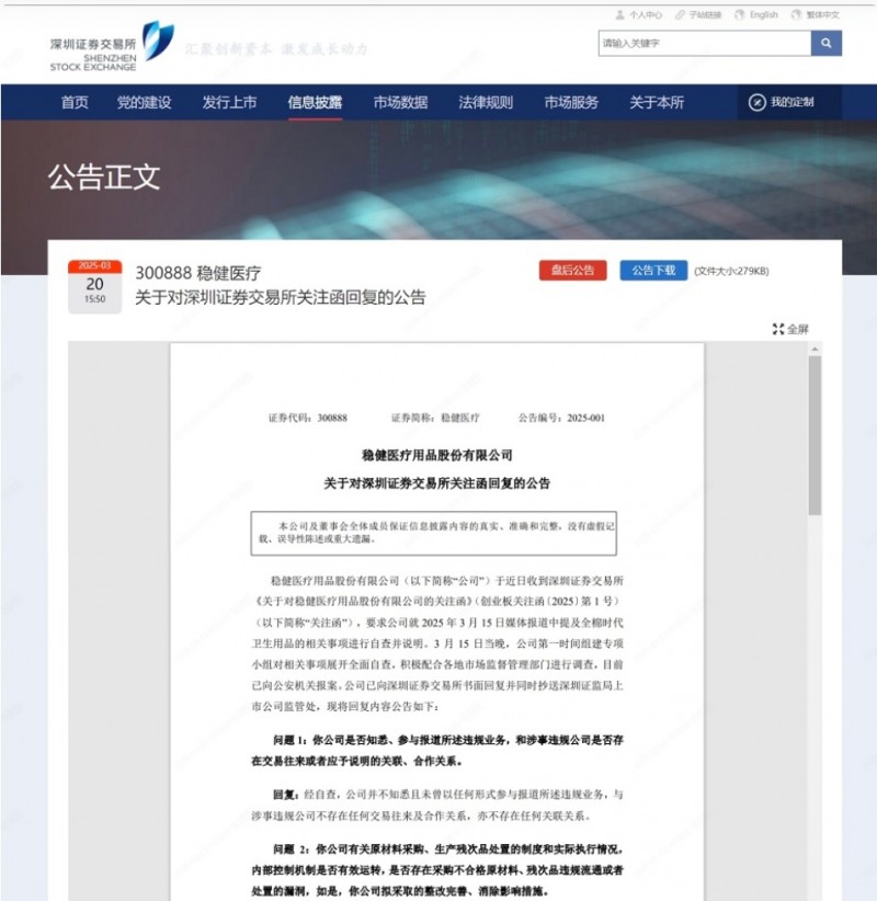 3月20日,稳健医疗回复深交所关注函中声明,3月15日当晚,旗下品牌全棉时代第一时间组建专项小组对相关事项展开全面自查,积极配合各地市场监督管理部门进行调查,目前已向公安机关报案。经自查,全棉时代与涉事企业无任何业务往来、合作关系及关联关系,未参与315报道中所述违规业务。针对众多网友关注的原材料及残次料处理问题,公告做了详细说明。“公司对原材料供应商准入、来料质量检测和入库、生产投料等环节进行全流程管控,确保全流程记录完整且可追溯,不存在采购和使用不合格原材料的情形。同时,对残次料均按照《废品管理规定》进行收集、分类、登记、切断等处理,再将处理后的残次料交由具备回收处理资质的回收主体处置,符合内部控制管理机制。为进一步保障消费者利益,公司立即终止与回收主体关于卫生用品残次料处置业务的合作;所有卫生用品残次料由公司自行采用粉碎或环保焚烧等方式销毁,并保存记录备查,杜绝其成为卫生用品原料源头的可能性;同时,进一步完善《废品管理规定》,加强员工内控意识和操作流程的培训。”