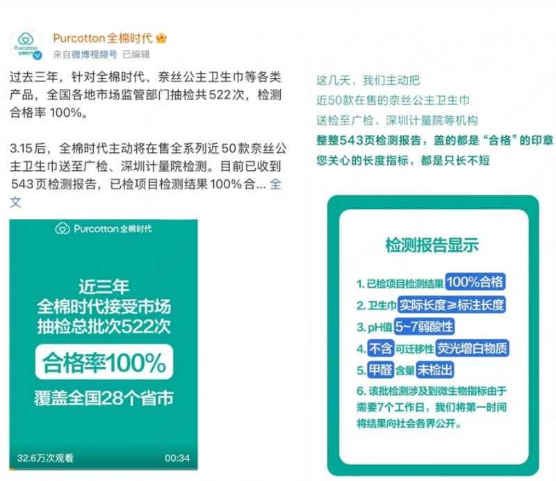 此外,记者注意到,全棉时代近日通过官方微博、微信公众号连续发布内容,公开其产品质检结果、残次料处理升级流程,以及奈丝公主卫生巾生产线。