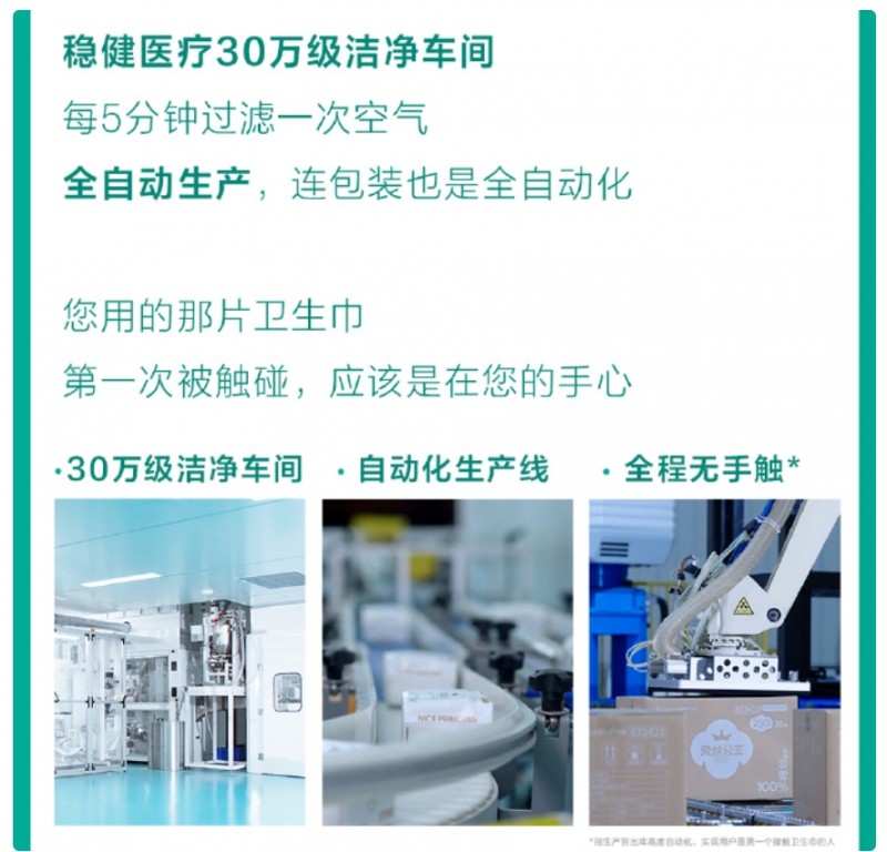 公开卫生巾生产产线:30万级净化车间,全自动化生产,全程无手触,确保消费者是第一个接触产品的人。