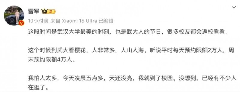 雷军发文:“这段时间是武汉大学最美的时刻,也是武大人的节日,很多校友都会返校看看。这个时候到武大看樱花,人非常多,人山人海。听说平时每天预约限额2万人,周末预约限额4万人。”