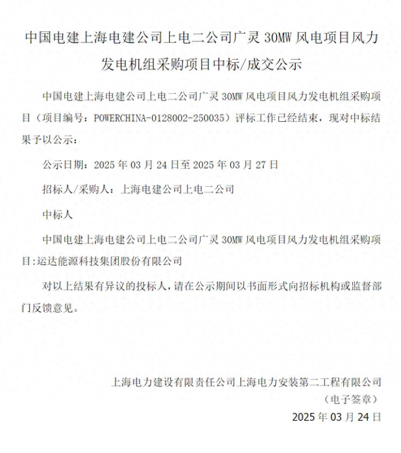3月24日,中国电建上海电建公司上电二公司广灵30MW风电项目风力发电机组采购项目入围公示,运达股份中标。