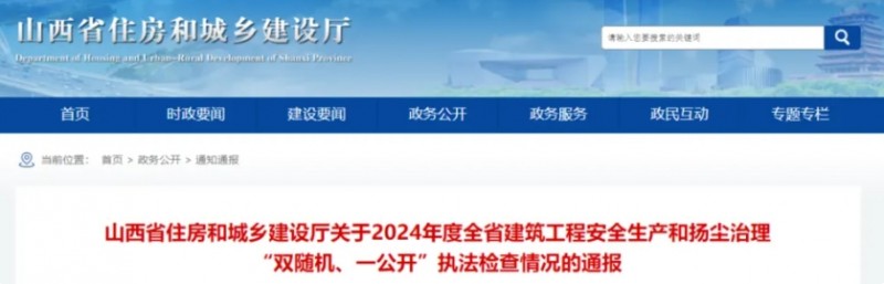 山西省住建厅发布的通报显示,为切实加强建筑工程安全生产管理,严格落实扬尘治理措施,2024年5月至10月,山西省住房和城乡建设厅组织开展了山西省全省建筑工程安全生产和扬尘治理 “双随机、一公开” 执法检查工作。