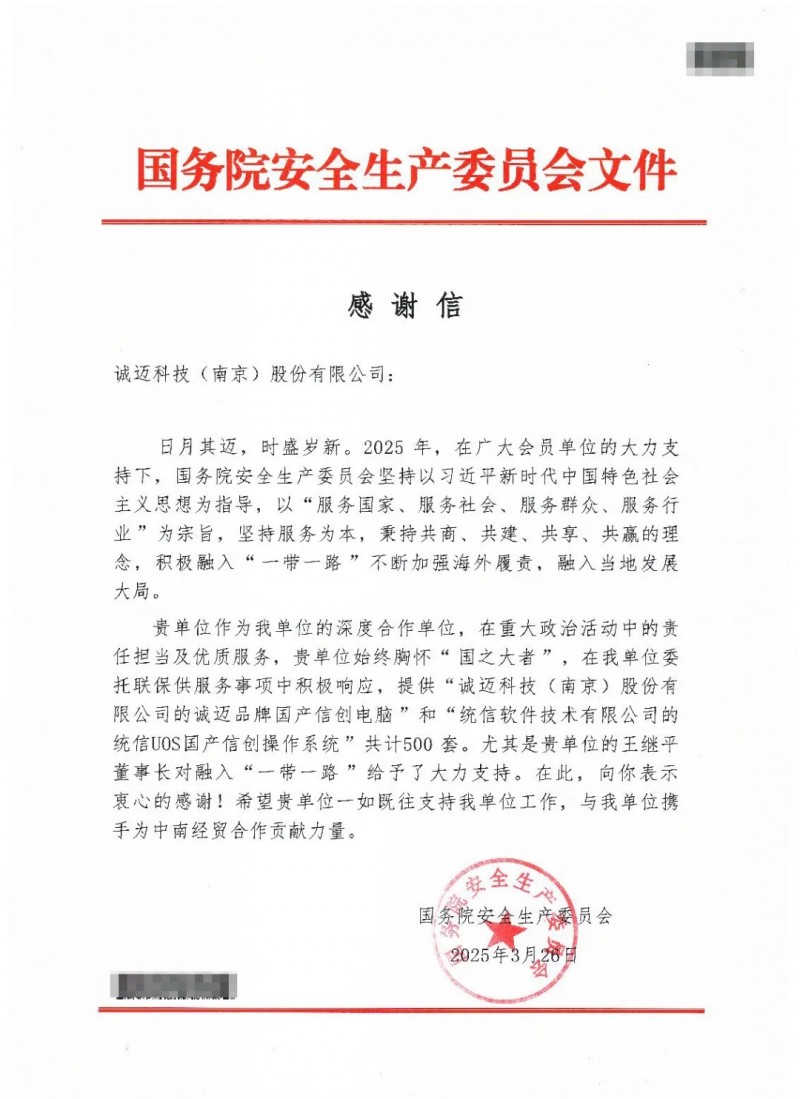 国务院安全生产委员会在信中表示:作为我单位的深度合作单位,诚迈科技展现出了在重大政治活动中的责任担当及优质服务。诚迈科技始终胸怀“国之大者”,在我单位委托联保供服务事项中积极响应,提供“诚迈科技(南京)股份有限公司的诚迈品牌国产信创电脑”和“统信软件技术有限公司的统信UOS国产信创操作系统”共计500套。信中还特别感谢了诚迈科技董事长王继平对融入“一带一路”给予的大力支持。