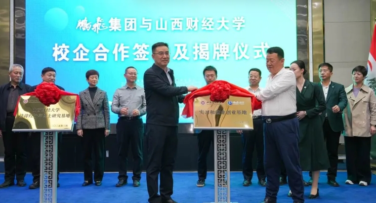 当天,鹏飞集团与山西财经大学正式缔结战略合作伙伴关系,鹏飞集团董事局主席兼总裁郑鹏与山西财经大学党委副书记、校长田祥宇见证并为“法律经济学博士研究基地”“实习就业创业基地”揭牌。