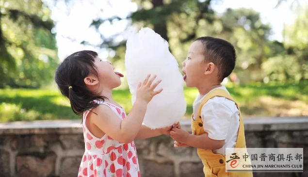 一对兄妹正在公园里一起吃一根棉花糖。图/视觉中国