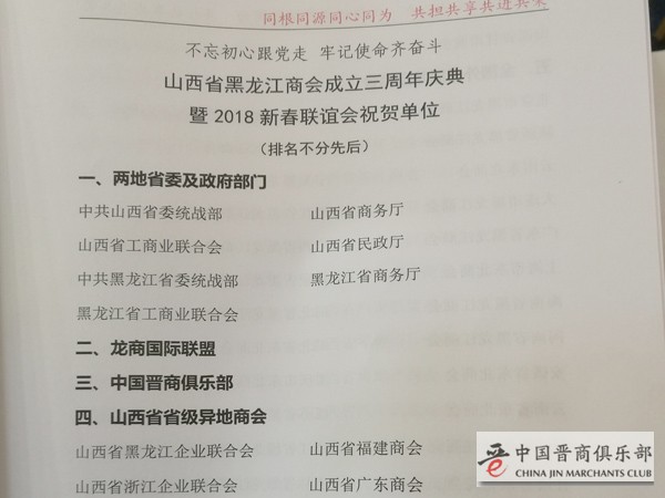 山西省黑龙江商会自2014年成立以来,在社会各界的帮助下,为在晋的东北老乡打造了一个温暖的家,风起浪涌,自当扬帆破浪;任重道远,更需策马扬鞭!希望通过我们今后的努力,为国家、社会、以及各位会员送上更多帮助,希望全体在晋龙商企业家们能够进一步团结合作、互帮互助,在企业经营、经济建设和社会发展中做出更多重要贡献,为早日实现中国梦而共同奋斗!
