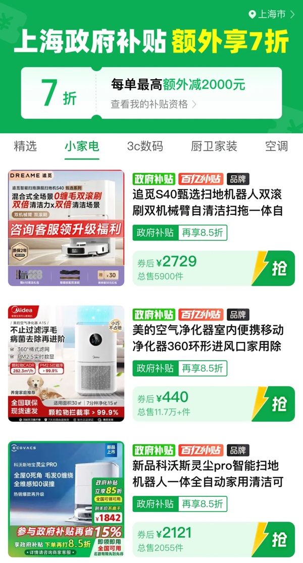 在拼多多“国补”专区,目前上海等地已可在政府补贴外享“折上折”。
