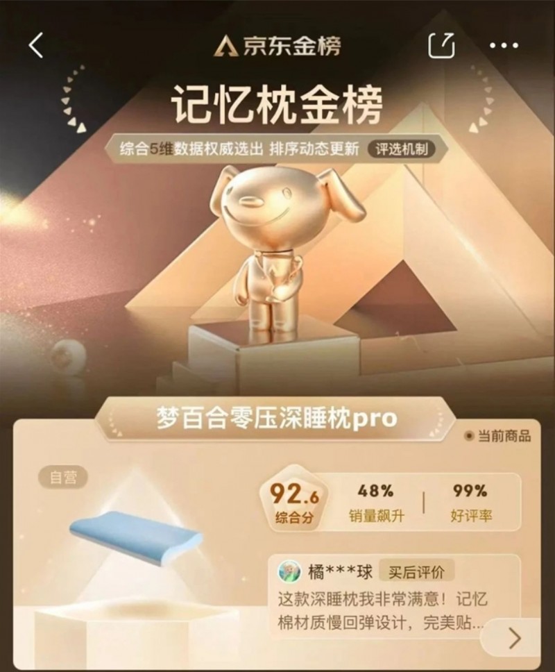 此外,该产品还登上了京东记忆枕金榜TOP1、抖音品牌卧室记忆枕曝光榜TOP2、天猫枕头热卖榜TOP3等榜单。