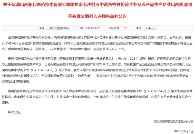 4月7日,国家组织药品联合采购办公室(以下简称联合采购办公室)发布公告,持有人山西阳和医药技术有限公司(以下简称山西阳和)委托山西国润制药有限公司(以下简称山西国润)生产的帕拉米韦注射液不符合药品生产质量管理规范要求,联合采购办公室决定取消山西阳和帕拉米韦注射液中选资格,同时将山西阳和与山西国润列入“违规名单”,暂停两家企业自2025年4月8日至2026年10月7日参与国家组织药品集中采购活动的申报资格。