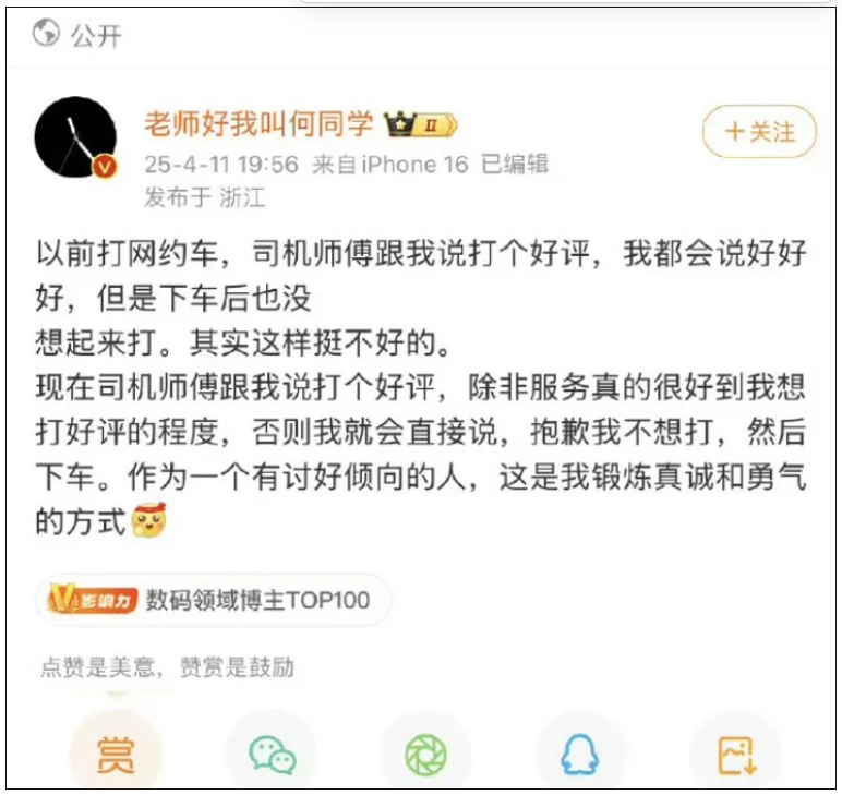 他提到,过去面对司机的好评请求会口头答应但事后遗忘,如今改为直接拒绝,并称这是克服“讨好型人格”的锻炼方式。而这引发了不少网友的反感,认为其太傲慢。