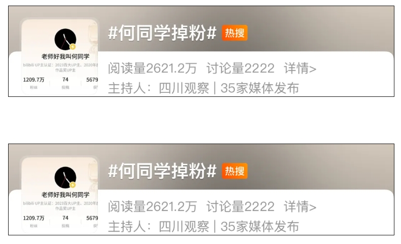 目前,何同学多个账号视频评论区已被类似文案攻陷。第三方数据平台显示,何同学B站账号一夜掉粉过万。目前其已删除涉事微博,暂未做出公开回应。