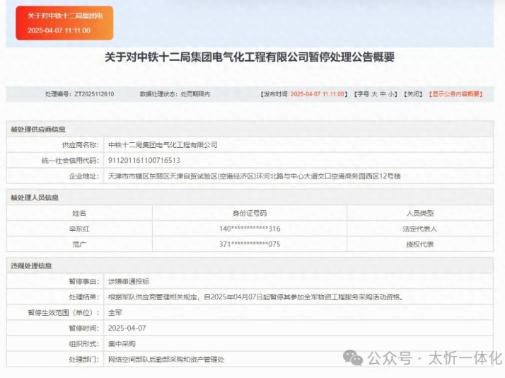 近日,记者注意到,军采网于4月7日发布了关于暂停中铁十二局集团电气化工程有限公司相关业务的公告概要。