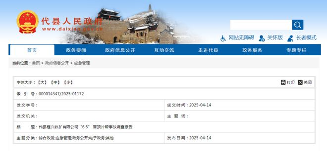 近日,代县人民政府网站公布了《代县程兴铁矿有限公司“6·5”冒顶片帮事故调查报告》。经调查认定,该事故是一起因违章冒险作业造成的生产安全责任事故,且存在瞒报行为。