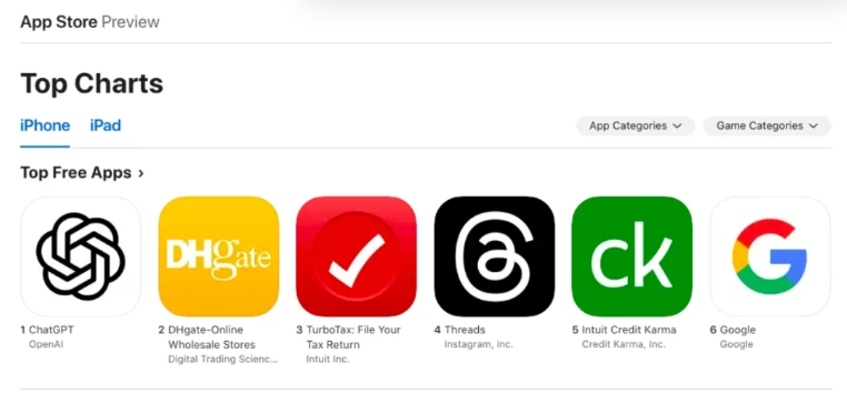 4月15日,一家在国内声量不大的跨境电商“敦煌网”,突然在美区苹果应用商店“免费应用程序”下载排名中跃升至第二,仅次于ChatGPT。