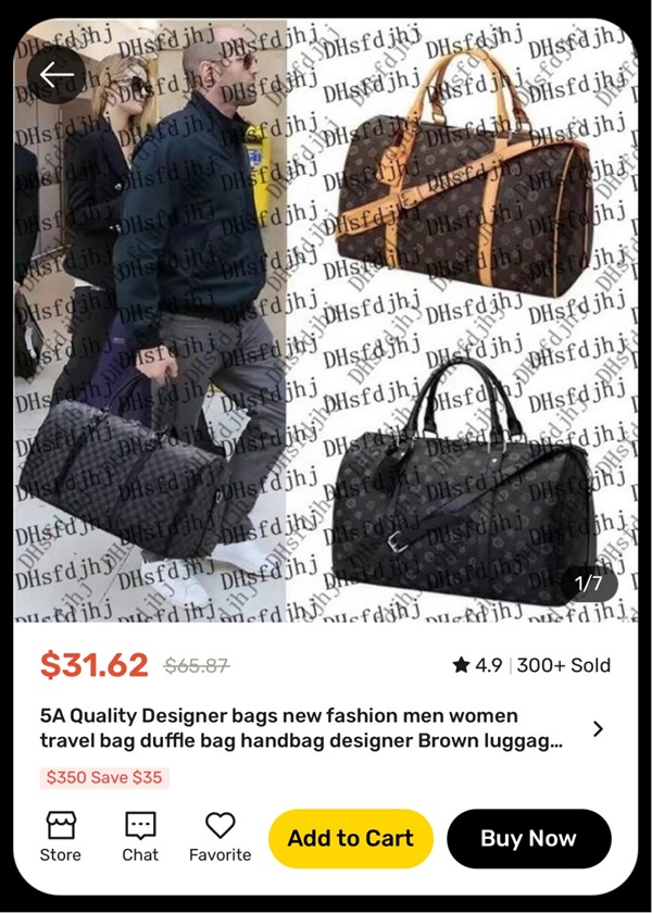 形似法国品牌路易威登的旅行包,售价31.62美元,页面显示已有300多件商品售出。
