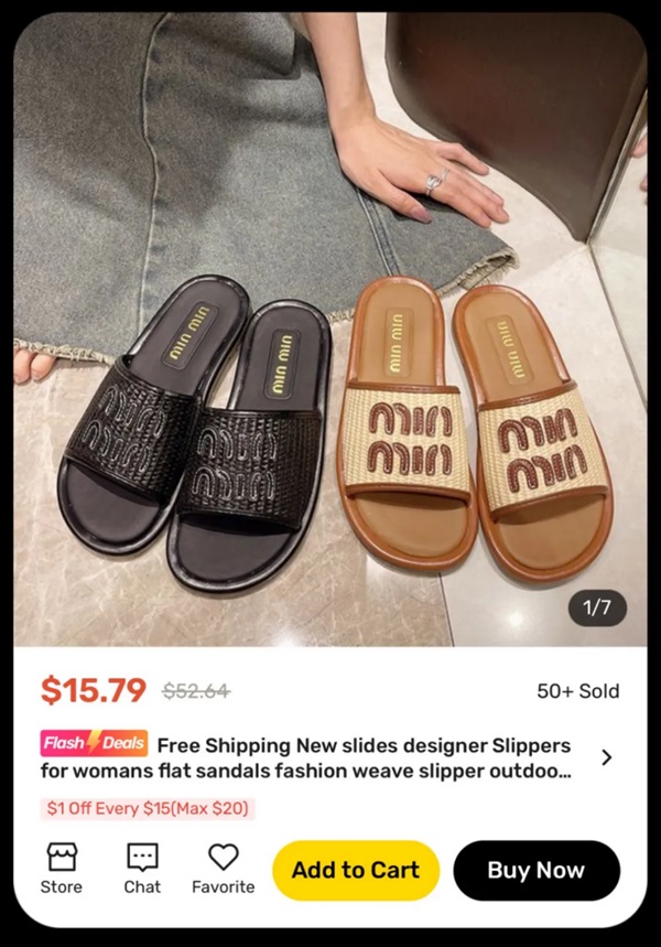 Logo为“MinMin”的拖鞋,模仿的是意大利品牌“MiuMiu”,售价为15.79美元。这种商品在“中国小商品之都”义乌的夜市上随处可见。迪奥的正版法语是“CHRISTIAN DIOR”,仿版之一名为“CHBISITAN BIOA”。路易威登的“老花”图案是四叶花卉和四角星,仿版之一的图案则形似而非完全一致。