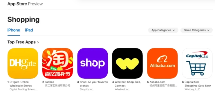 4月16日,苹果应用程序的“购物”类目排行榜。图片/杨立赟