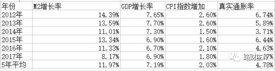 进一步的,如果考虑到2012年底新一届领导人上任以来,经济上不再强调货币刺激,而是希望通过市场的结构性改革来解决经济发展中出现的问题。中国的广义货币供应增长率大幅度放缓,所以如果采用近5年的数据,结果将会乐观很多(下表是2012年以来的M2、GDP、官方通胀、真实通胀的增长率)。