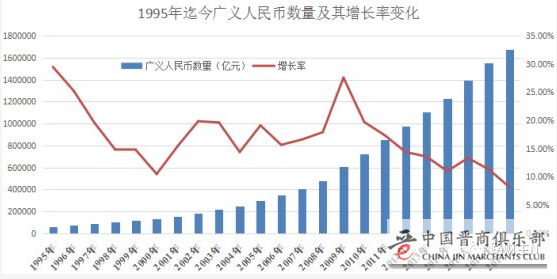 1995年底的时候,中国的广义人民币供应量大约是6.075万亿元,今天已经变为167.68万亿元,折算下来,广义货币数量变为1995年底的27.6倍。