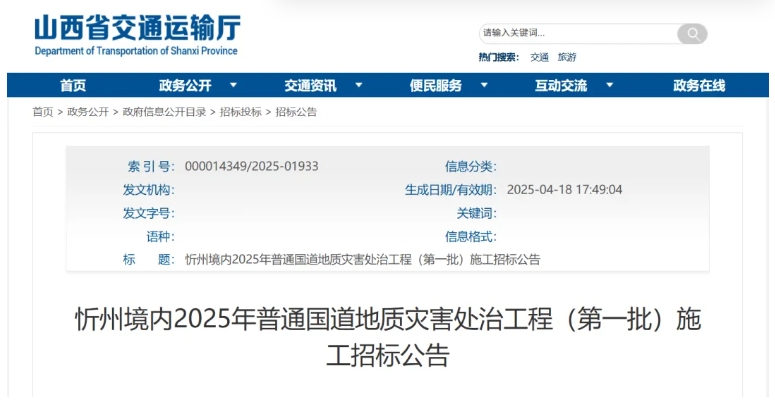 4月18日,山西省交通运输厅消息,忻州境内2025年普通国道地质灾害处治工程(第一批)开始招标。根据招标公告,忻州境内将有6条国道拟进行养护施工。