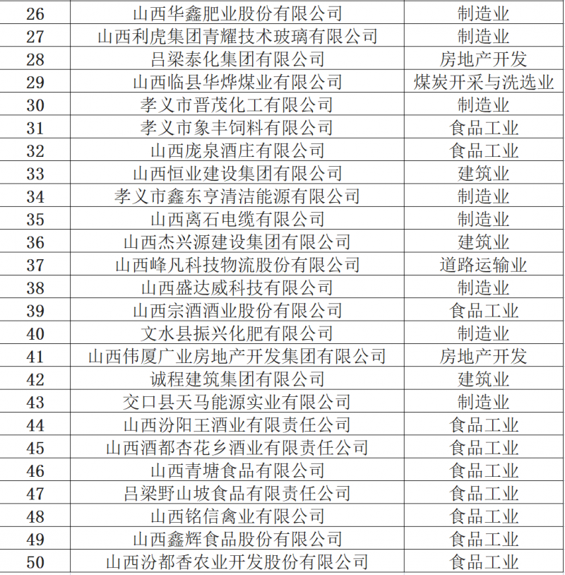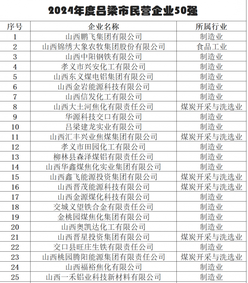 此次上榜企业行业分布广泛,涵盖制造业、食品工业、煤炭开采与洗选业、房地产开发、建筑业、道路运输业等多个领域,反映出吕梁市民营经济多元化发展的良好态势。在制造业领域,有多家企业凭借先进技术和创新管理模式入选,展现了吕梁制造业的强劲实力;食品工业企业则以优质产品和品牌影响力,在市场中占据一席之地;煤炭开采与洗选业企业在资源整合和绿色发展方面取得了显著成效。