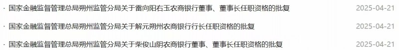 批复显示,国家金融监督管理总局朔州监管分局于4月17日同时批复核准解元任朔州农商银行行长,雷向阳任右玉农商银行董事、董事长,柴俊任山阴农商银行董事、董事长的任职资格。