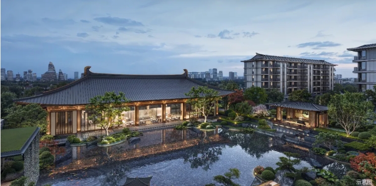 在社区园林方面,北京国贤府贰期在社区格局遵循盛唐大明宫营造礼制,呈现出门庭、厅堂、庭园三进礼序;府门高阔,中厅承含元殿规制,中心湖景仿照太液池“一池三山”造园手法,打造近2600㎡湖景大境,园中山水林瀑、飞鸟游鳞、镇宅之宝相得益彰,居游山水之间,俯仰皆是天地自然的逸美。建筑屋面沿袭传统九脊殿歇山顶形式,四翼舒展,大气伟逸,再现大气与庄重的盛唐建筑美学。