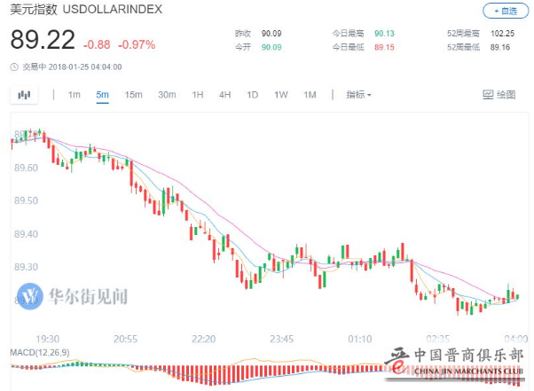 美元指数连跌三日,周三美股早盘跌幅扩大至0.8%,午盘后跌幅扩大至1%或91点,刷新2014年12月19日以来盘中低点至89.19。既是一周多里最大单日跌幅,也是2014年12月以来首次跌破90的门槛,今年以来已经累跌3%。