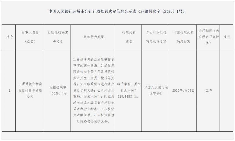 网络安全违规方面,山西运城农商行未按规定履行网络安全保护义务,在数字化金融快速发展的当下,银行网络安全关乎客户个人信息和资金安全。
