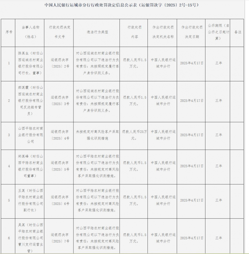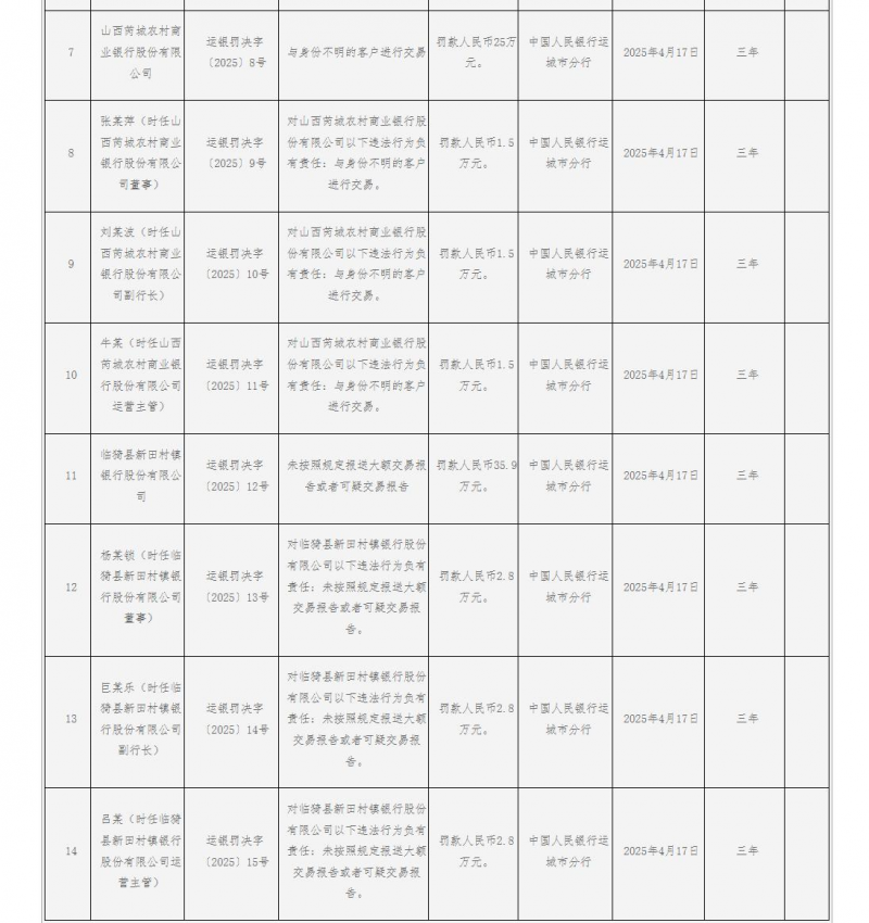 此次处罚中涉及8家农商行,累计收到27张罚单。从违法行为类型来看,客户身份识别违规问题最为突出,多家银行因未落实客户身份识别制度被重罚。山西蒲县、浮山、翼城、隰县农村商业银行股份有限公司均未按规定开展持续的客户身份识别,其中蒲县农商行因此被罚款56.26万元,浮山、翼城、隰县农商行分别被罚款23.4万元、23.3万元、23.4万元,相关责任人各被罚款1.5万元。山西运城农村商业银行股份有限公司(简称:山西运城农商行)未按照规定履行客户身份识别义务,被罚款115.868万元,时任行长、董事陈某生和反洗钱专管员郝某霞各被罚款1.5万元。山西平陆农村商业银行股份有限公司未按规定对高风险客户采取强化识别措施,被罚款25万元,相关责任人郑某峰、王某、吴某各被罚款1.5万元。山西芮城农村商业银行股份有限公司与身份不明的客户进行交易,被罚款25万元,相关责任人张某萍、刘某波、牛某各被罚款1.5万元。