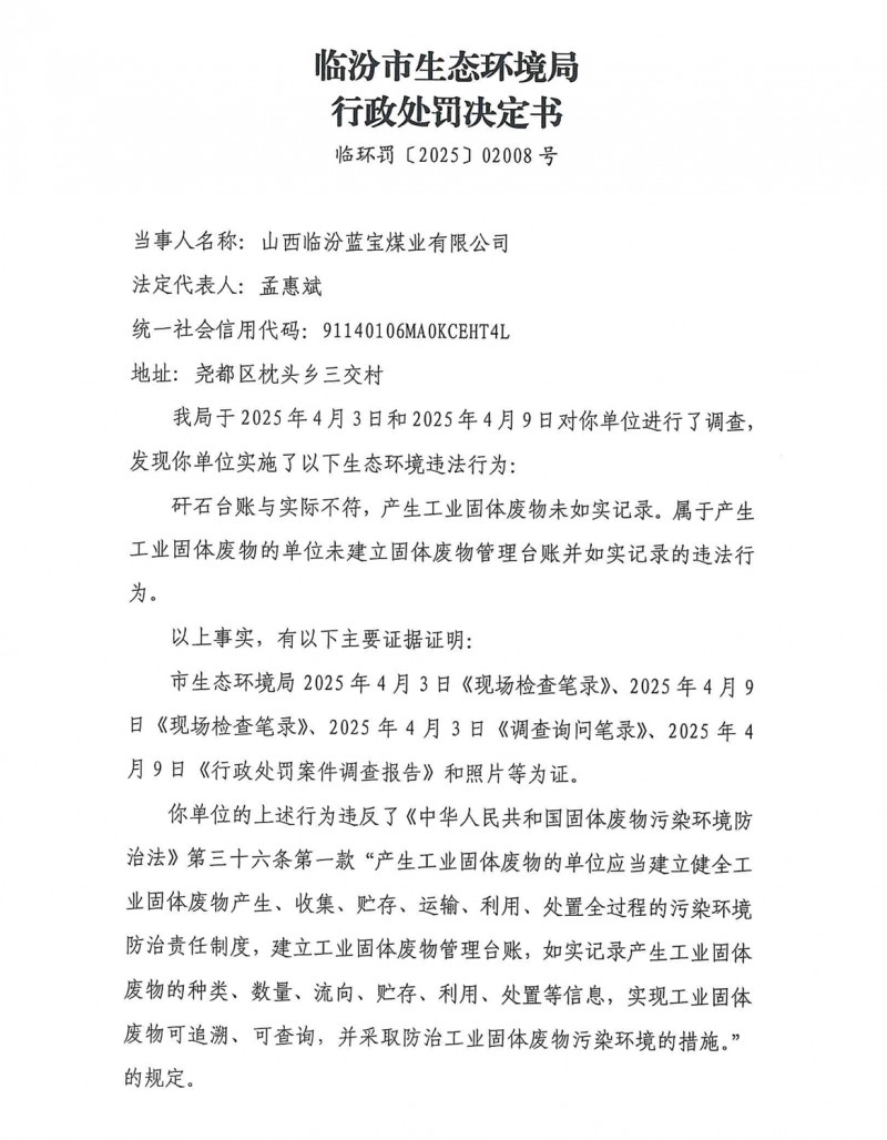 山西临汾蓝宝煤业生态环境违法被处罚9万元
