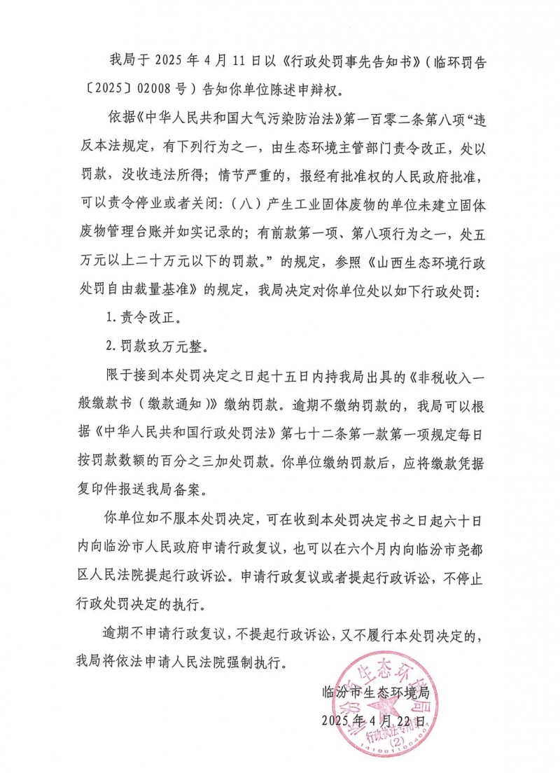 山西临汾蓝宝煤业生态环境违法被处罚9万元。