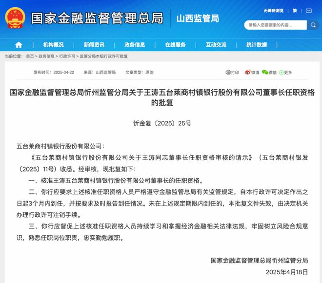 近日,国家金融监督管理总局山西监管局公布批复,核准王涛五台莱商村镇银行股份有限公司董事长的任职资格。