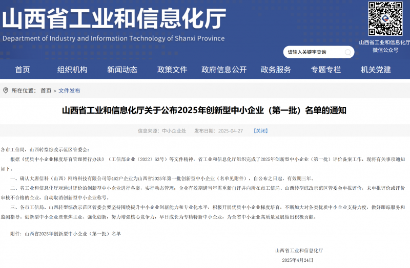 近日,山西省工业和信息化厅发布重要通知,确认大唐信科(山西)网络科技有限公司等462户企业为山西省2025年第一批创新型中小企业。这一举措是根据《优质中小企业梯度培育管理暂行办法》(工信部企业〔2022〕63号)等文件精神开展,旨在进一步提升中小企业创新能力和专业化水平,促进全省中小企业高质量发展。