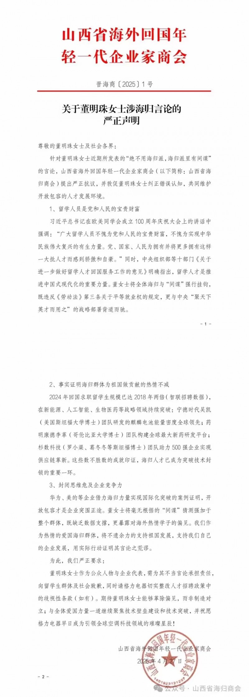 4月27日,山西省海外回国年轻一代企业家商会,简称山西海归商会,公开发文要求格力电器董明珠道歉,据悉这是第一个公开要求董明珠道歉的商会。
