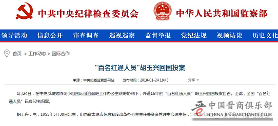 中央纪委监察部网站消息,1月24日,在中央反腐败协调小组国际追逃追赃工作办公室统筹协调下,外逃16年的“百名红通人员”胡玉兴回国投案自首。至此,全国“百名红通人员”已有52名归案。