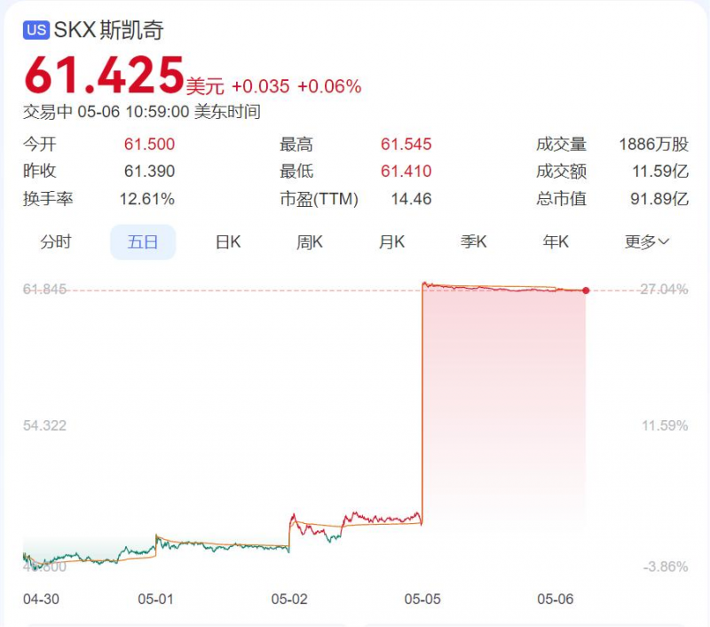 5月5日,斯凯奇股价一度飙升25%,创下七年多来最高盘中涨幅。