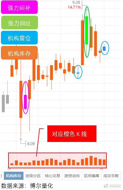 上文图中的橙色柱状,是我用系统观察的「机构交易特征」数据叫做「机构库存」。