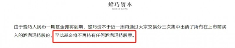 5月7日,蜂巧资本发文称,“由于蜂巧人民币一期基金即将到期,蜂巧资本于近一周内通过大宗交易分三次集中出清了所有在上市前买入的泡泡玛特股份,至此基金将不再持有任何泡泡玛特股票。”泡泡玛特5月7日收盘跌5.43%,报收于184.5港元。