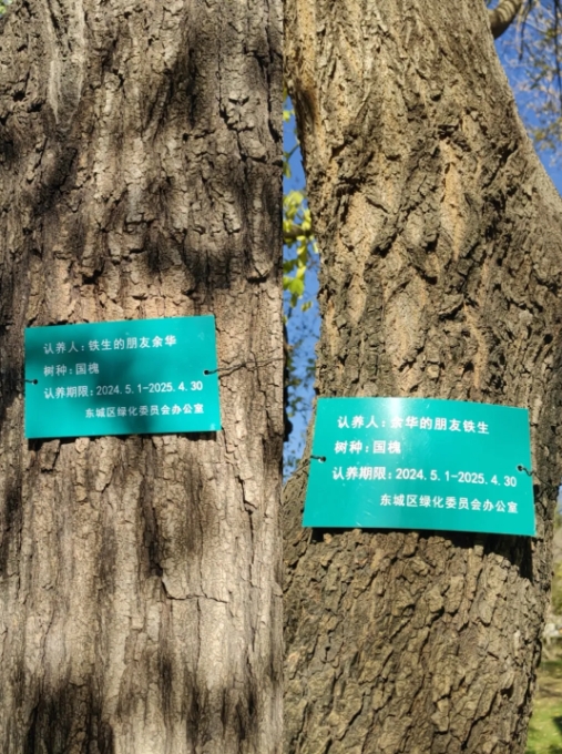 “五一”期间,北京地坛公园两棵国槐树登上了热搜,原因是这两棵树上面分别写着“认养人:余华的朋友铁生”“认养人:铁生的朋友余华”,认养期限已于2025年4月30日到期。